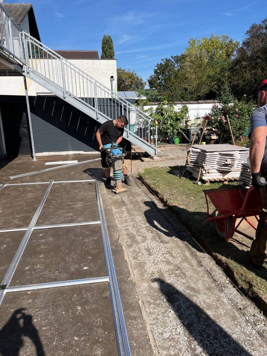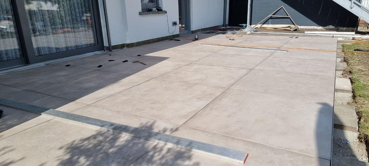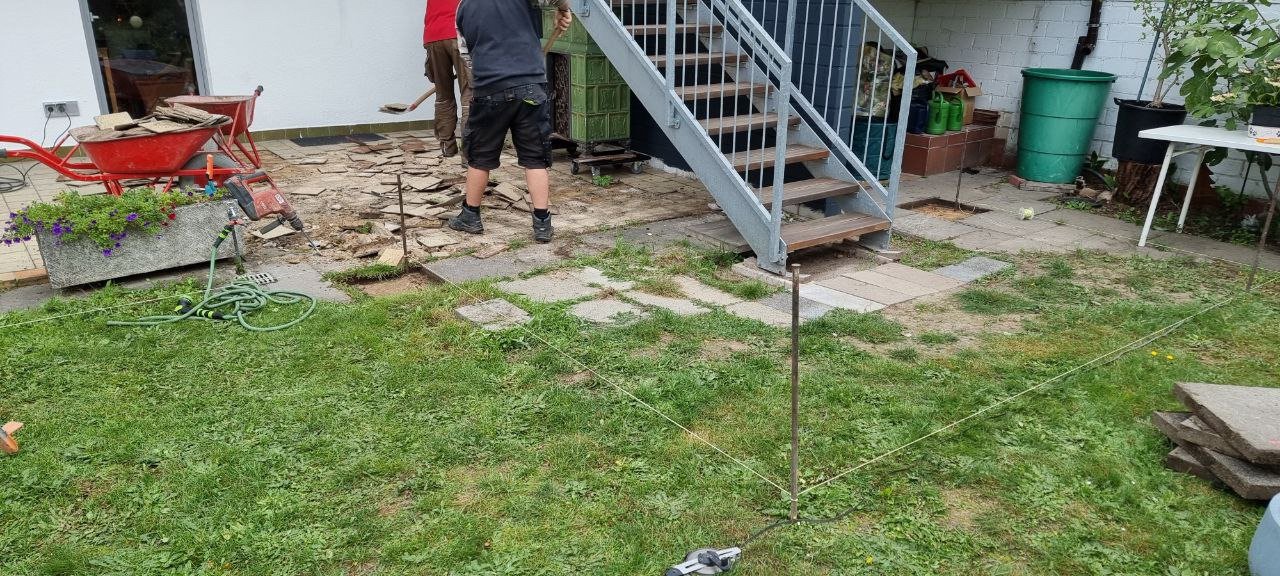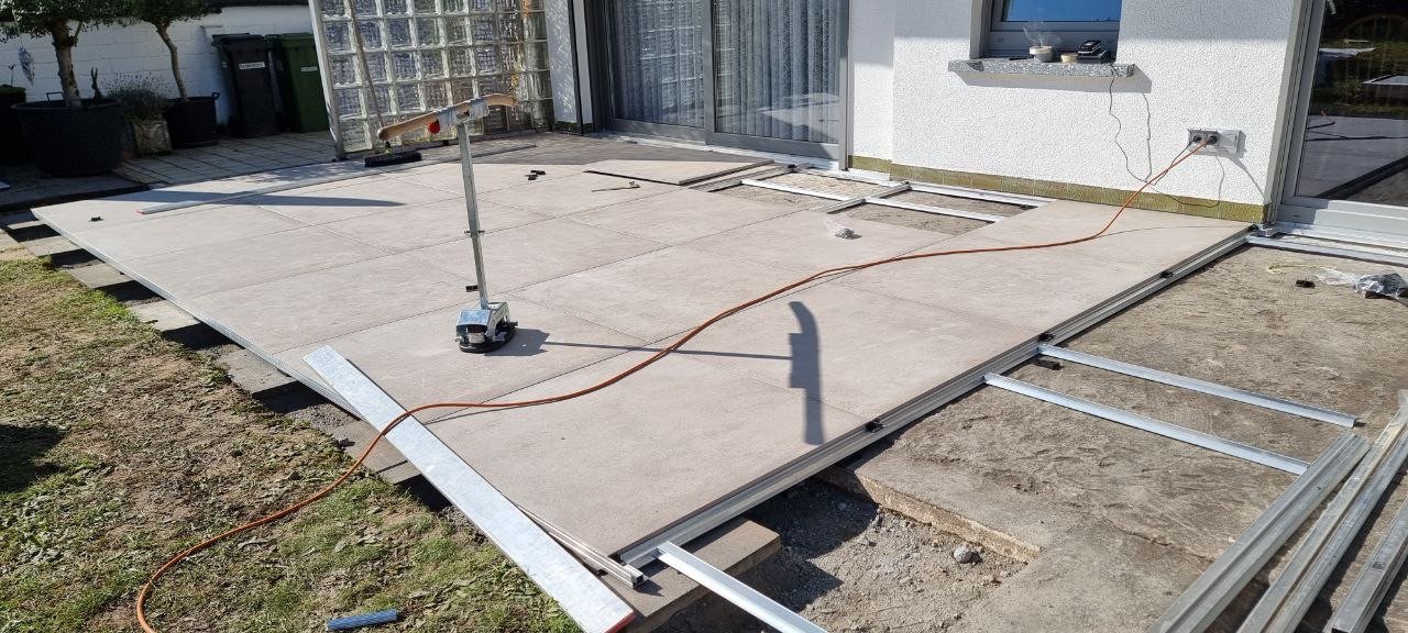 Hierbei handelt es sich um eine Außengestaltung mit dem Talux-System von der Firma Talux für eine neue Terrassengestaltung. Zuerst wurden die alten Terrassenplatten entfernt und anschließend wurde die Fläche neu aufgebaut. Bei diesen Arbeiten wurden neue Rohre für die Verlegung von wichtigen Kabeln erschaffen. Daraufhin begannen die Arbeiten zur Verlegung für das Talux-System. Das Talux-Schienensystem ist ein Aluminium-Profilsystem, auf dem sich Stein-, Keramik- und kalibrierte Natursteinplatten sowie Holz- und WPC-Dielen einfach, schnell und wirtschaftlich verlegen lassen. Die Anwendungsbereiche sind zahlreich und umfassen u.a. Balkone, Terrassen, Flachdächer, Schwimmbad- und Pooleinfassungen, Dachterrassen und Gehwege. Aber auch individuelle Sonderbauten wie Treppenstufen oder Podeste sind umsetzbar. Anschließend wurden die Keramikplatten verlegt. Die Keramikplatten stammen von der Firma Fliesen Haus aus Münster. Nach der Verlegung der Keramikplatten war die Terrassengestaltung abgeschlossen und die Baustelle erledigt.