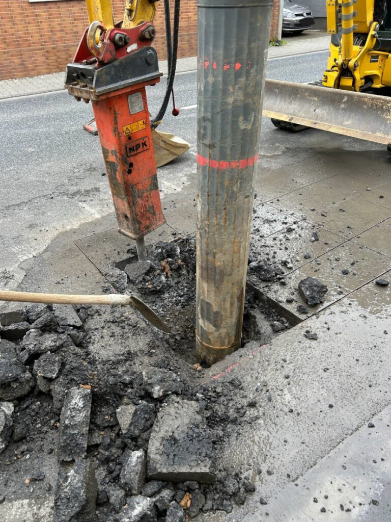 Nachdem der Bereich gesperrt war, konnten die Bauarbeiten beginnen. Als Erstes wurde der Bereich geöffnet, an dem später die Gasabtrennung erfolgen sollte. Die Öffnung erfolgte mit einem Hydraulikbagger, an dem ein Hammer angebracht war. Zusätzlich wurde ein Saugbagger eingesetzt, um die einzelnen Schichten schonend abzutragen.