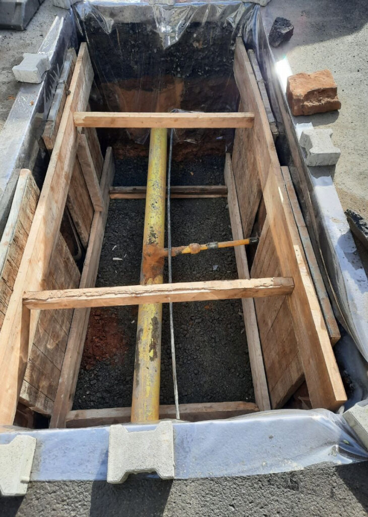 Nachdem die Baugrube vollständig geöffnet war, konnte unser Subunternehmer die Gasabtrennung problemlos ausführen. Anschließend wurde die Baugrube Schicht für Schicht ordnungsgemäß verfüllt. Danach wurde die Oberfläche asphaltiert und die Baustelle abgeschlossen.
