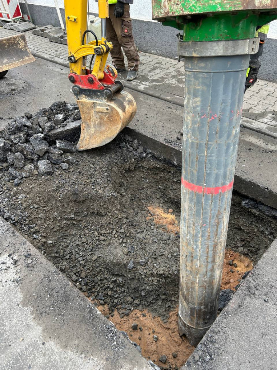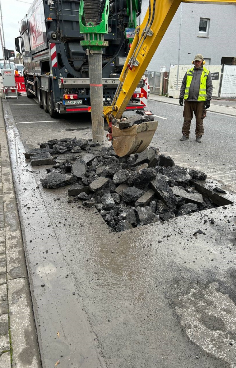 Nachdem der Bereich gesperrt war, konnten die Bauarbeiten beginnen. Als Erstes wurde der Bereich geöffnet, an dem später die Gasabtrennung erfolgen sollte. Die Öffnung erfolgte mit einem Hydraulikbagger, an dem ein Hammer angebracht war. Zusätzlich wurde ein Saugbagger eingesetzt, um die einzelnen Schichten schonend abzutragen.