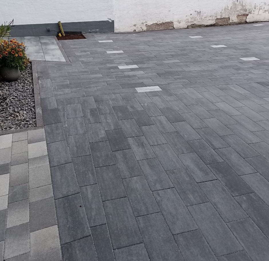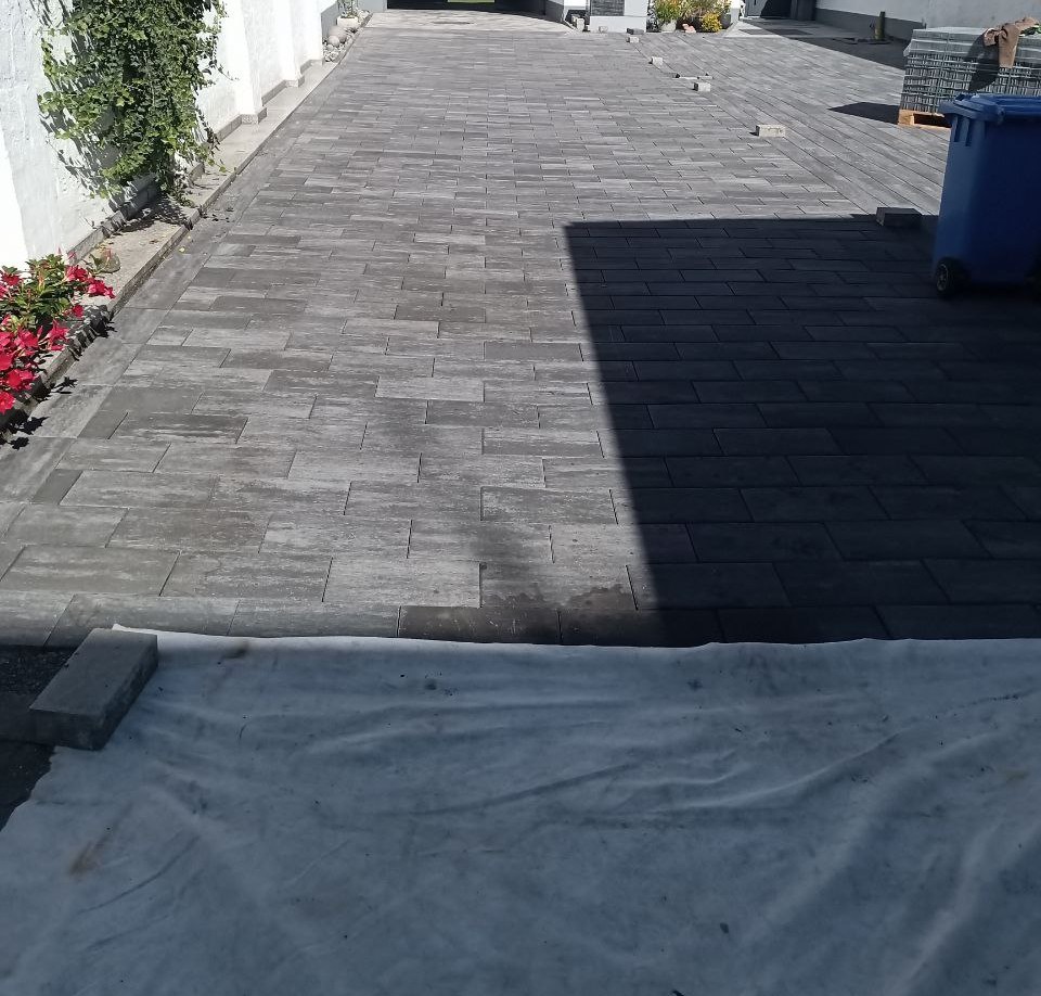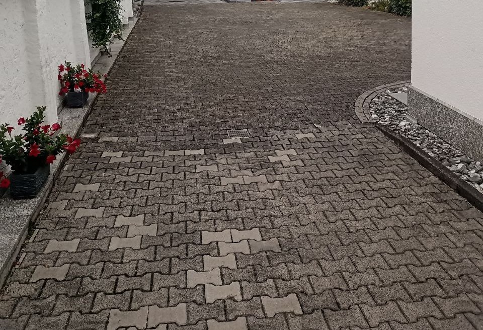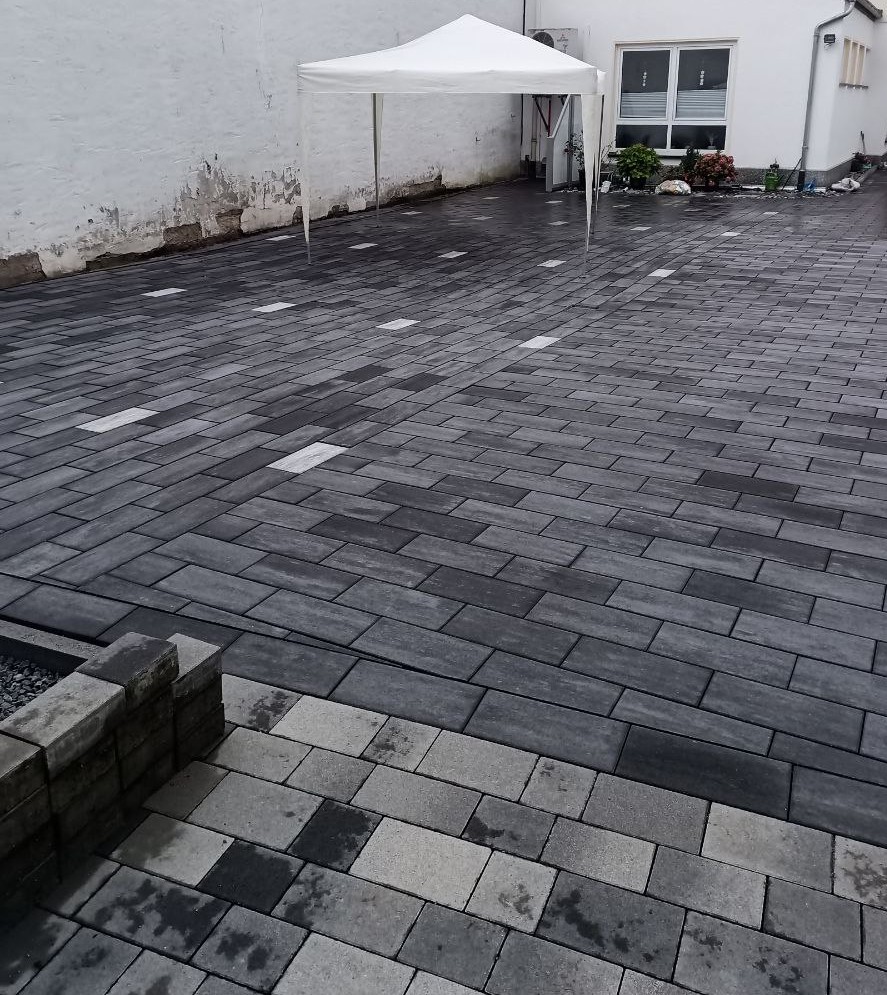 Zu guter Letzt wurden Steine ausgetauscht, sodass sie durch andere, die weiß gefärbt sind, als Parkzonen dienen. Daraufhin wurde alles abgerüttelt und die Körnung eingekehrt, sodass die Baustelle erledigt ist und die Hoferneuerung abgeschlossen.