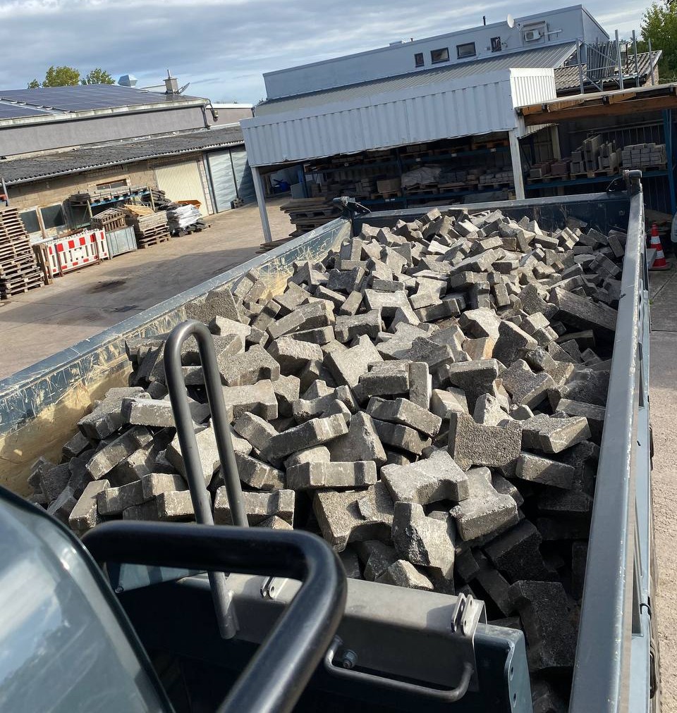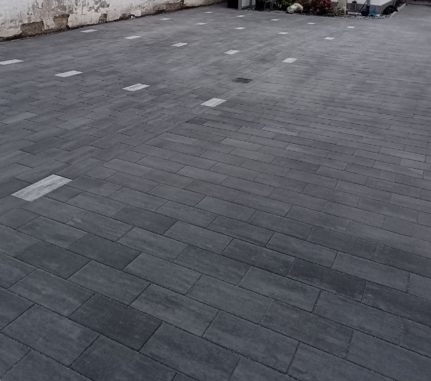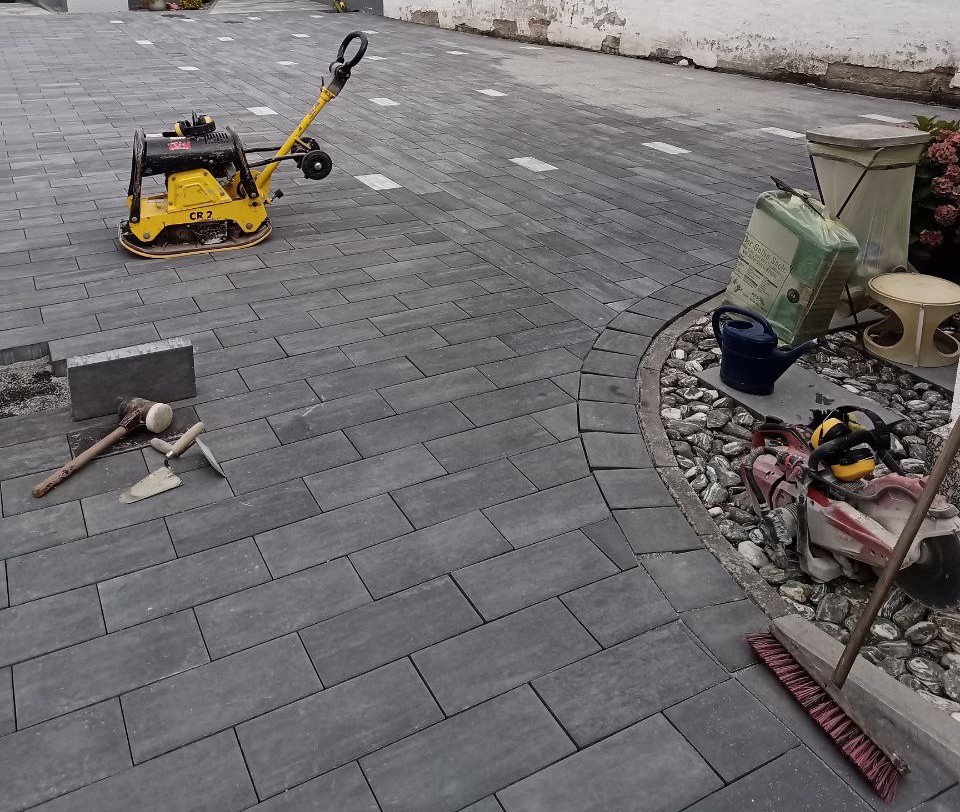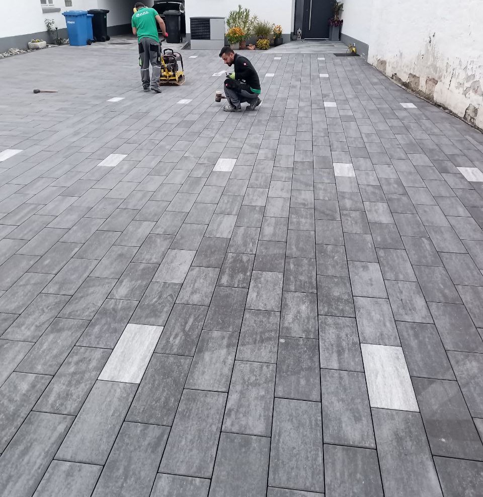 Zu guter Letzt wurden Steine ausgetauscht, sodass sie durch andere, die weiß gefärbt sind, als Parkzonen dienen. Daraufhin wurde alles abgerüttelt und die Körnung eingekehrt, sodass die Baustelle erledigt ist und die Hoferneuerung abgeschlossen.