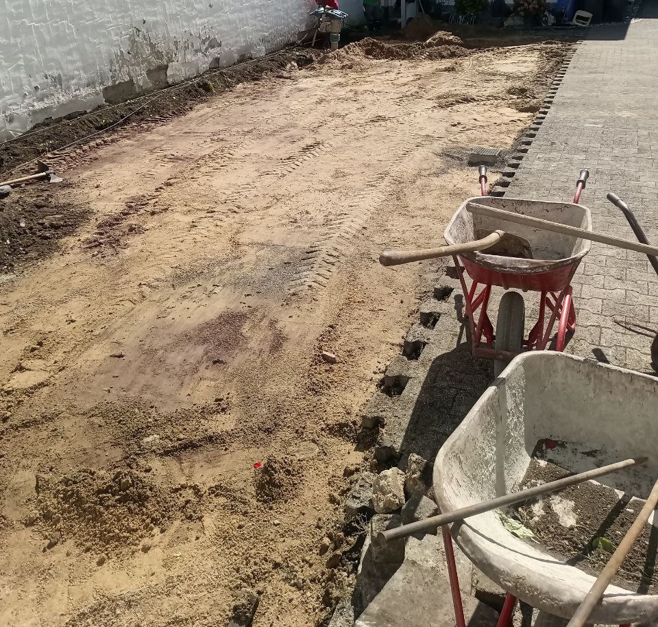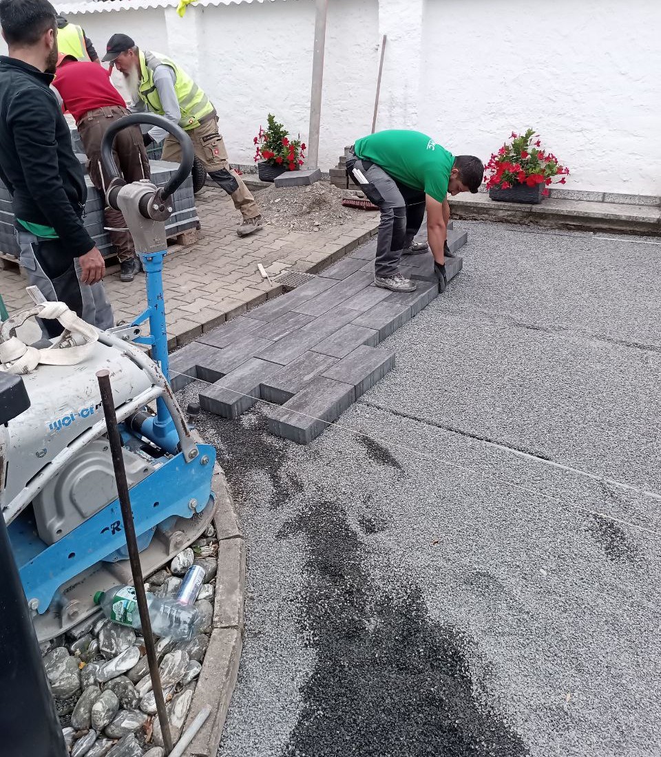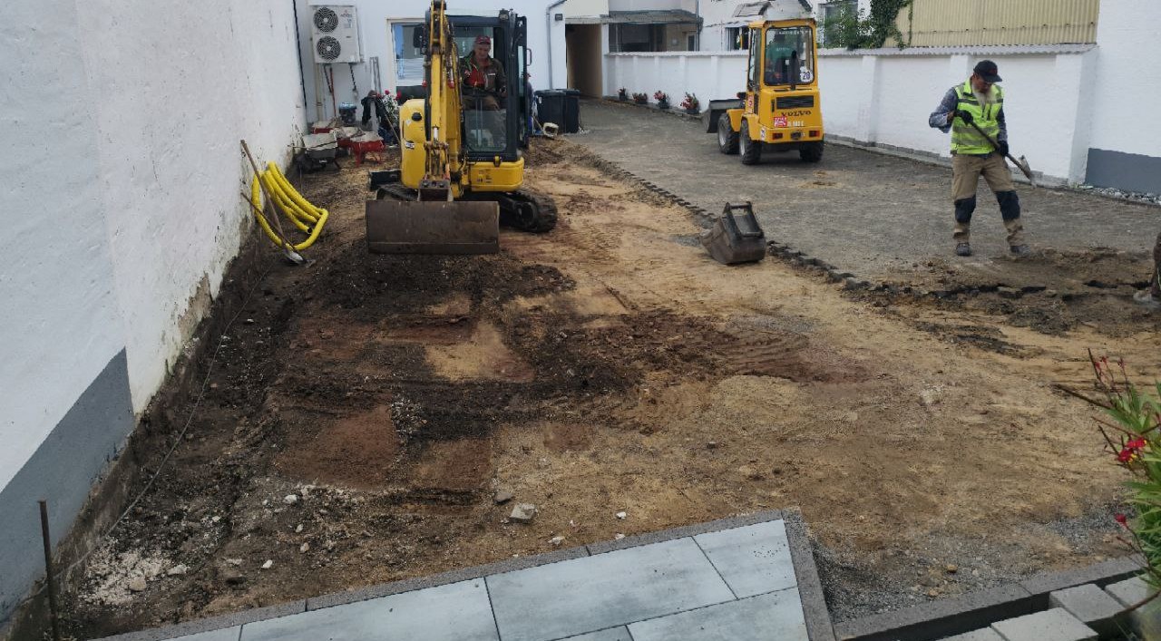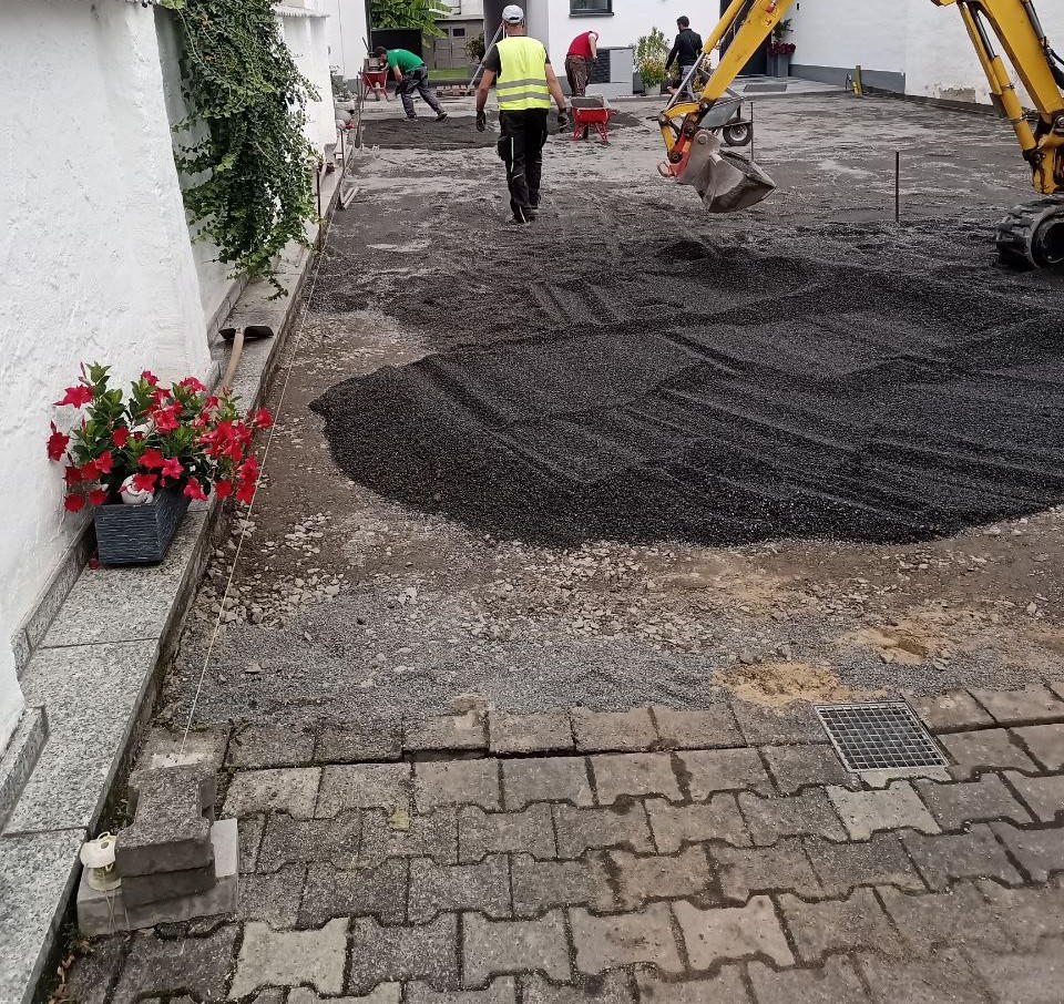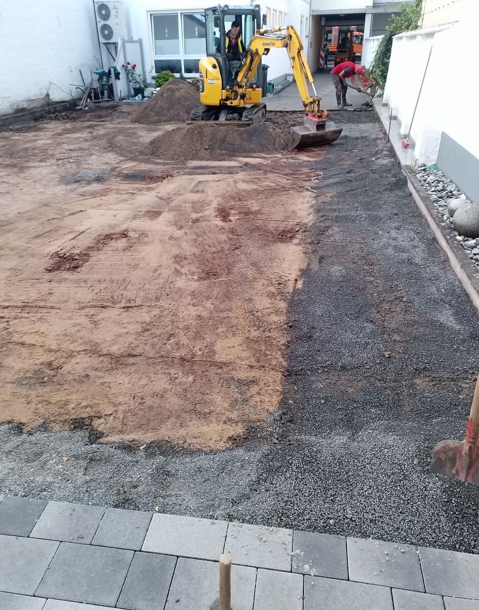 Zu Beginn wurde das vorhandene Pflaster abgetragen und sorgfältig entsorgt. Im Anschluss konnte der Untergrund für die Pflasterung beginnen. Dafür wurde eine Schotterschicht begradigt und danach mit Splitt abgezogen.