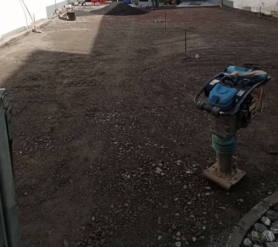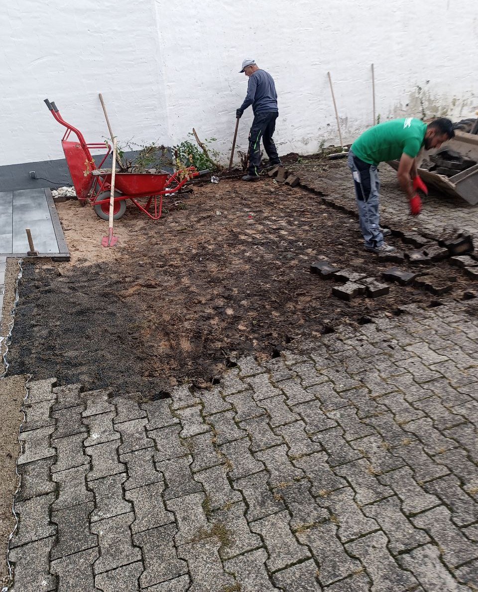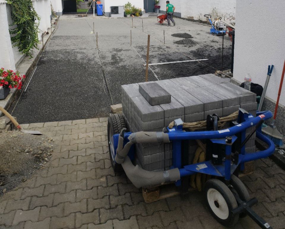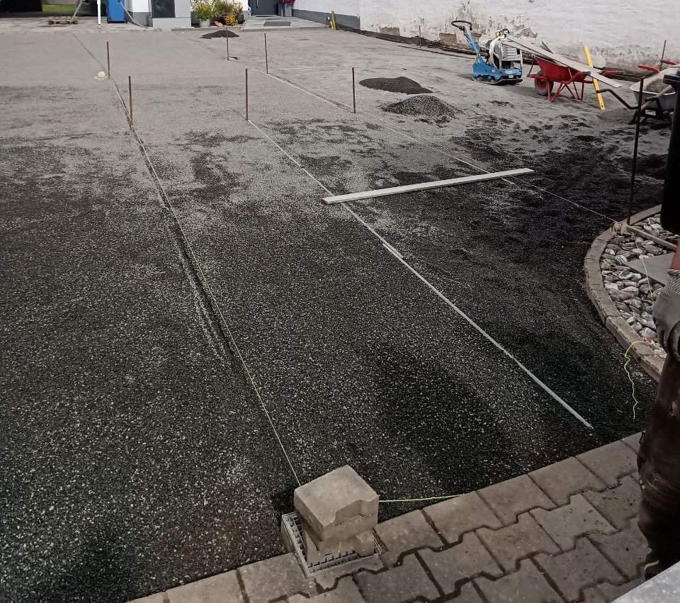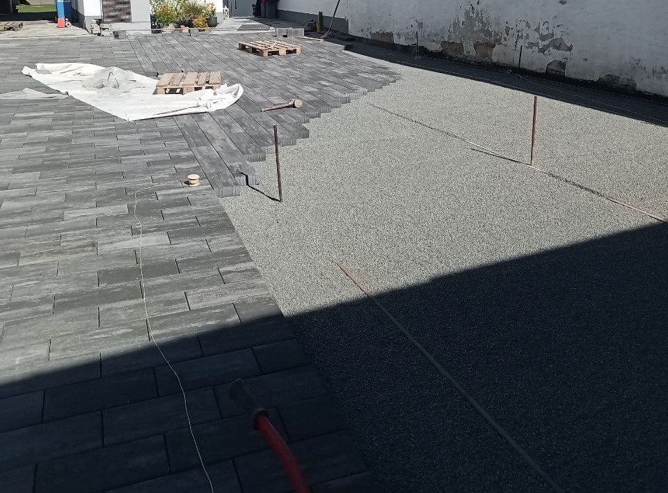Zu Beginn wurde das vorhandene Pflaster abgetragen und sorgfältig entsorgt. Im Anschluss konnte der Untergrund für die Pflasterung beginnen. Dafür wurde eine Schotterschicht begradigt und danach mit Splitt abgezogen.