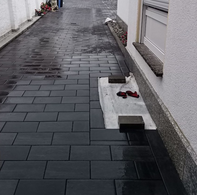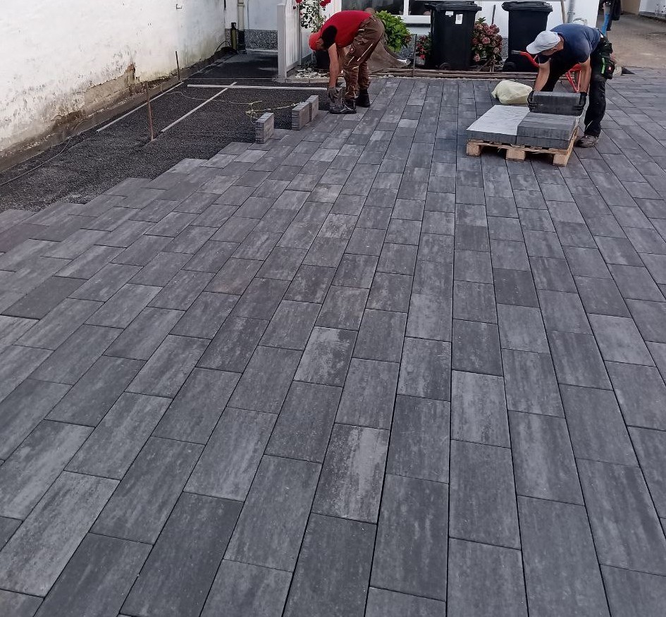 Nachdem der Untergrund vorbereitet war, gingen die Pflasterarbeiten los. Die Pflastersteine, mit „via Moderna 40x20x8 cm in der Farbe Achatgrau“, stammen von der Firma Kreher Beton aus Aschaffenburg. Auch das schlechte Wetter machte unseren Jungs nichts aus, denn mit einem Zelt konnten sie darunter weiter Fläche für Fläche pflastern.